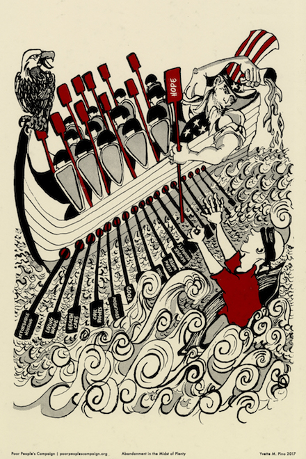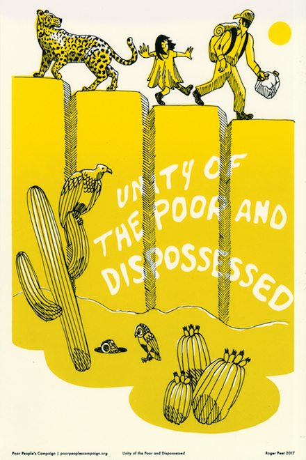 Created through a collaboration between the Kairos Center’s Charon Hribar and the Justseeds Artists’ Cooperative, the Poor People’s Campaign: A National Call for Moral Revival Portfolio features a series of twenty-five screenprints by twenty-four artists that express the fundamental principles and core concepts that guide the work of the new Poor People’s Campaign.